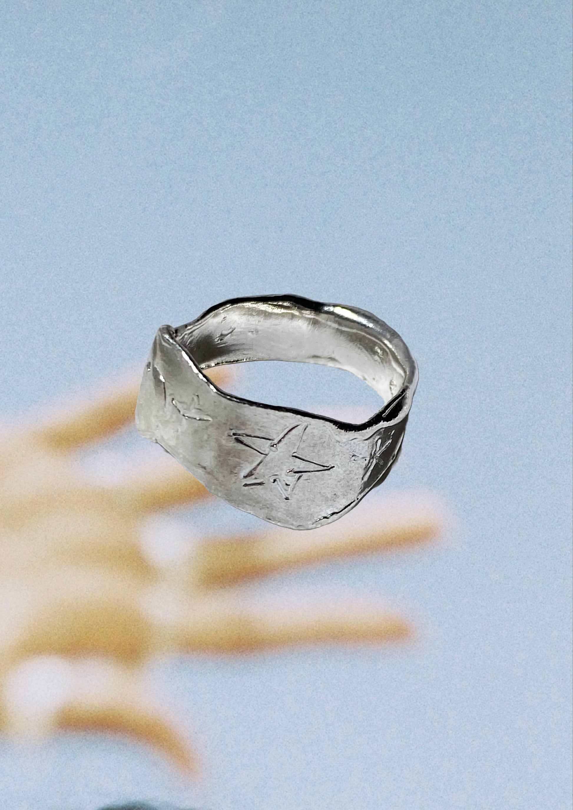 Handmade ring with funky, asymmetrical, engraved stars. 925 Silver. Ringsize 60.